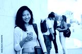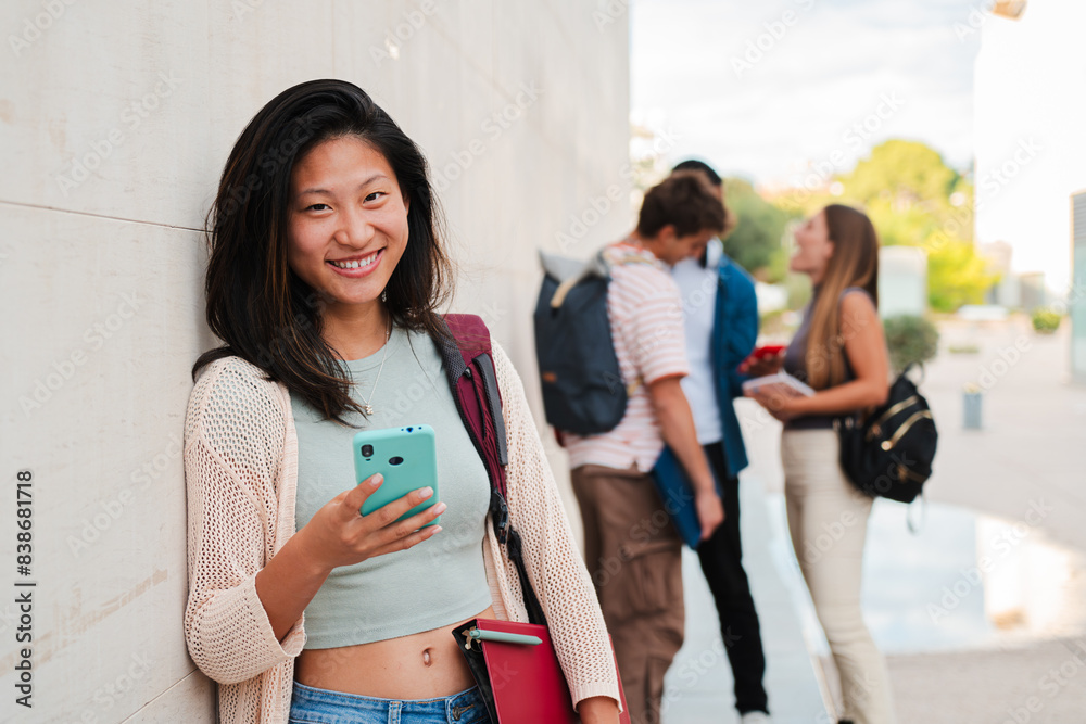 On foreground a chinese school girl smiling using a cellphone with her classmates at the background at university campus. Happy female teenage student with a smart phone device browsing with an app