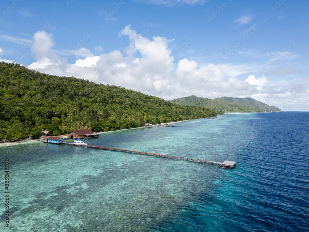 Raja Ampat, Indonesia: Aerial view of homestay along the dramatic coast of the Kri island in the Raja Ampat archipelago in West Papua