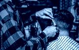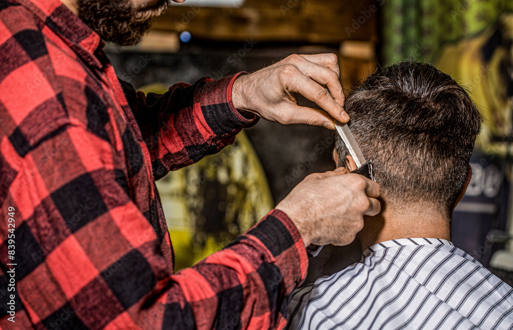 Hipster client getting haircut. Hands of barber with hair clipper. Haircut concept. Hairstylist serving client at barber shop. Man visiting hairstylist in barbershop