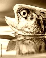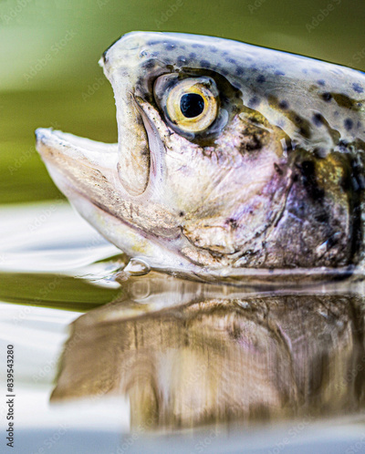Close-up of a trouts in the green water of a pond. Freshwater fish. Rainbow trouts close-up in water. The rainbow trout in the lake. Trouts in the green water of a mountain lake. Fishing