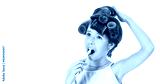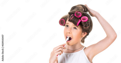 Little girl on morning, brushing teeth. Small lady in pyjamas. Teen in hair curlers. Little girl in hair curlers. Copy space