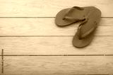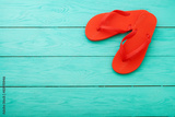 Flip flops on blue wooden background