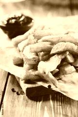 Fried Potatoes on old wooden cutting board. In instagram style f