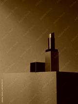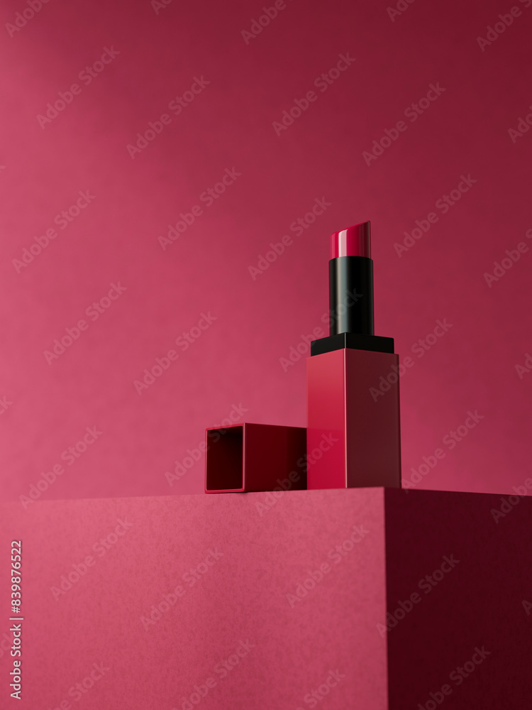 A luxury, elegance red lipstick on a red pedestal and red background with copy space.