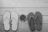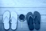 Colorful flip flops and candy on blue wooden floor. Top view and summer accessories