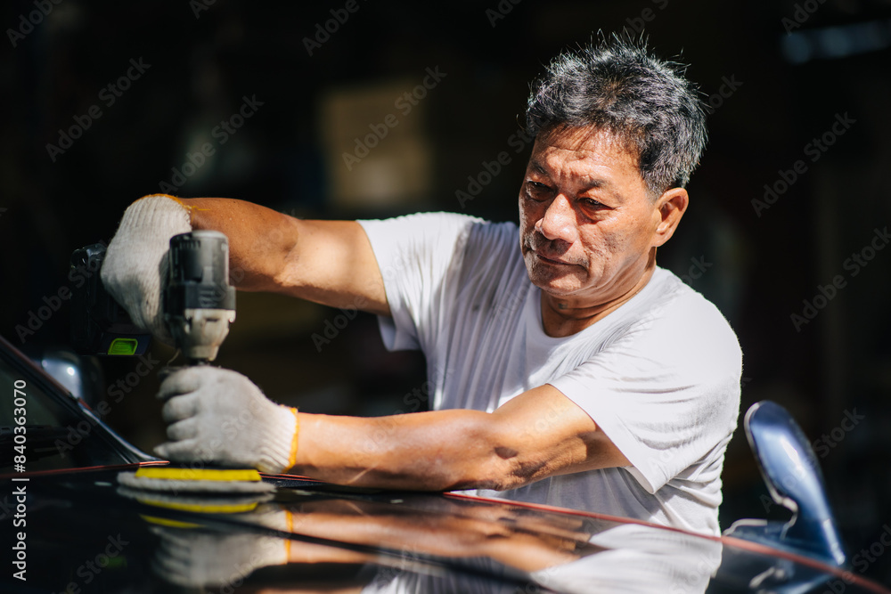 Car polishing, Worker in Auto workshop using color polisher machine polish coating wax in car care.