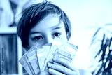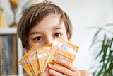 child holding euros, euro banknotes money in fan, euro money, rejoices in success, anticipates what to spend it on, encouraging good financial behavior, economic awareness, money management