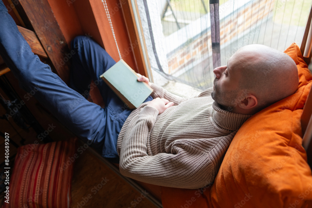 Young man relaxing with book on windowsill in old house, reclining on windowsill, self-reflection, quiet moment, private retreat