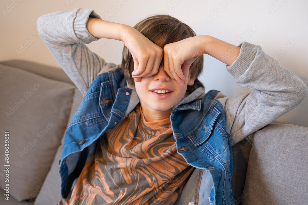 teenage boy playful covering eyes with hands, imitation binoculars, waiting for surprise, emotional expression, tender moment, childhood charm