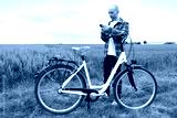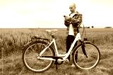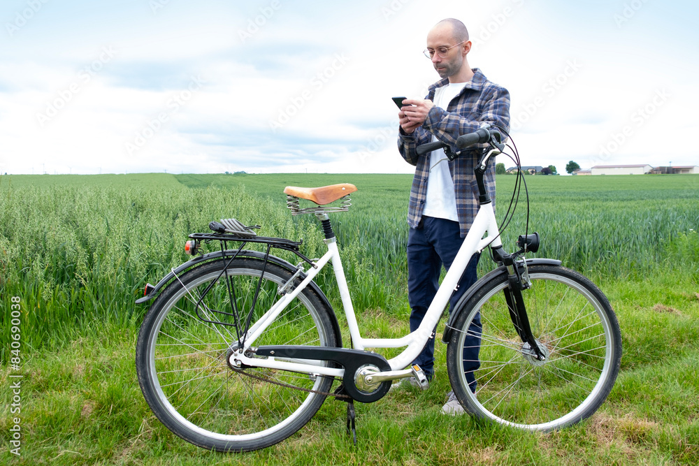 young man enjoys leisurely bike ride amidst lush green fields, embodying freedom, tranquility and connection with nature eco-friendly cycling offers