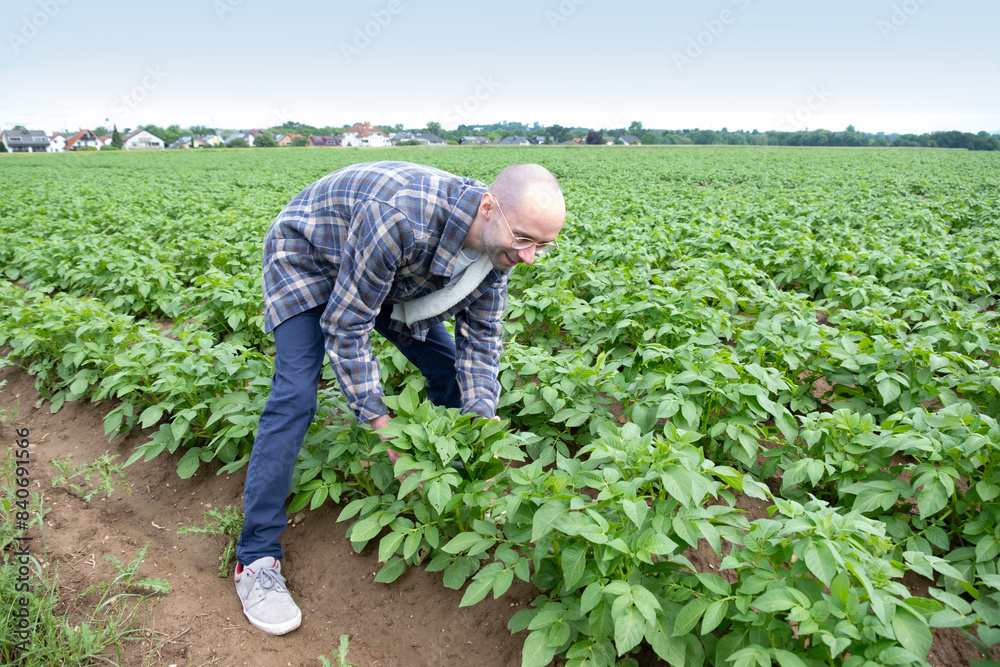 farmer checking quality potato crop, plant health green potato tops, tuberous herbaceous plant, Solánum tuberósum, agricultural scene, agricultural land, farm life