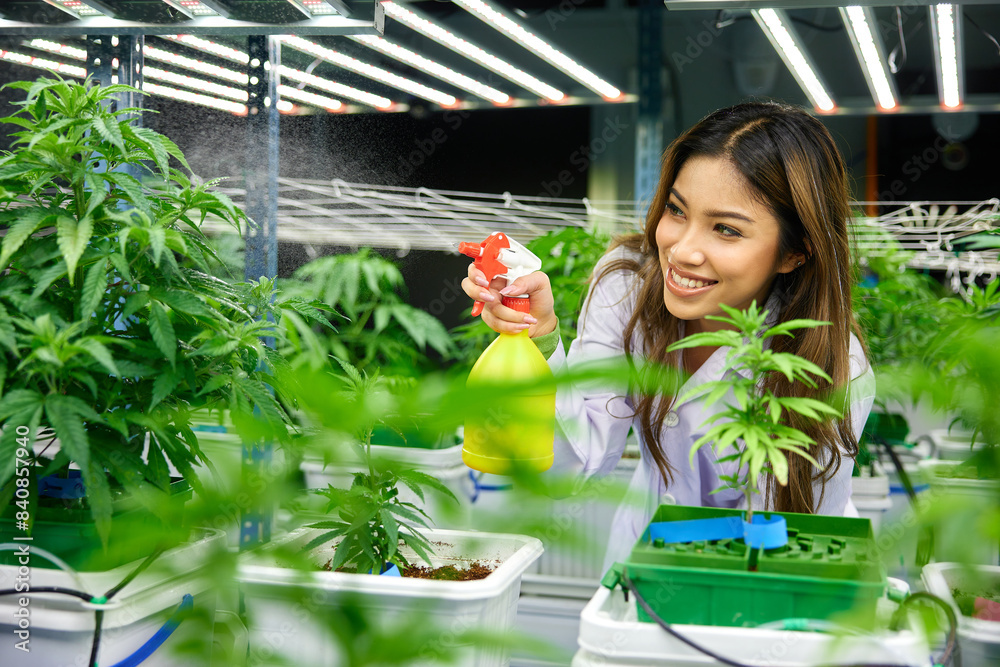 female scientist using aerosol can and watering spray to cannabis plants in the greenhouse