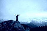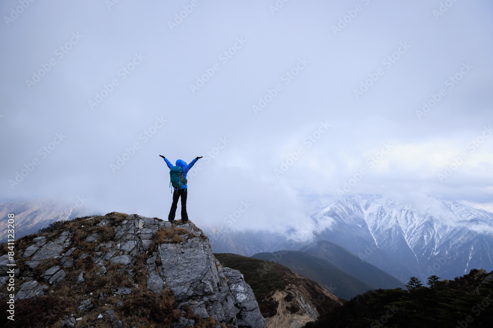Woman hiker enjoy the view on mountain top cliff edge face the snow capped mountains in tibet