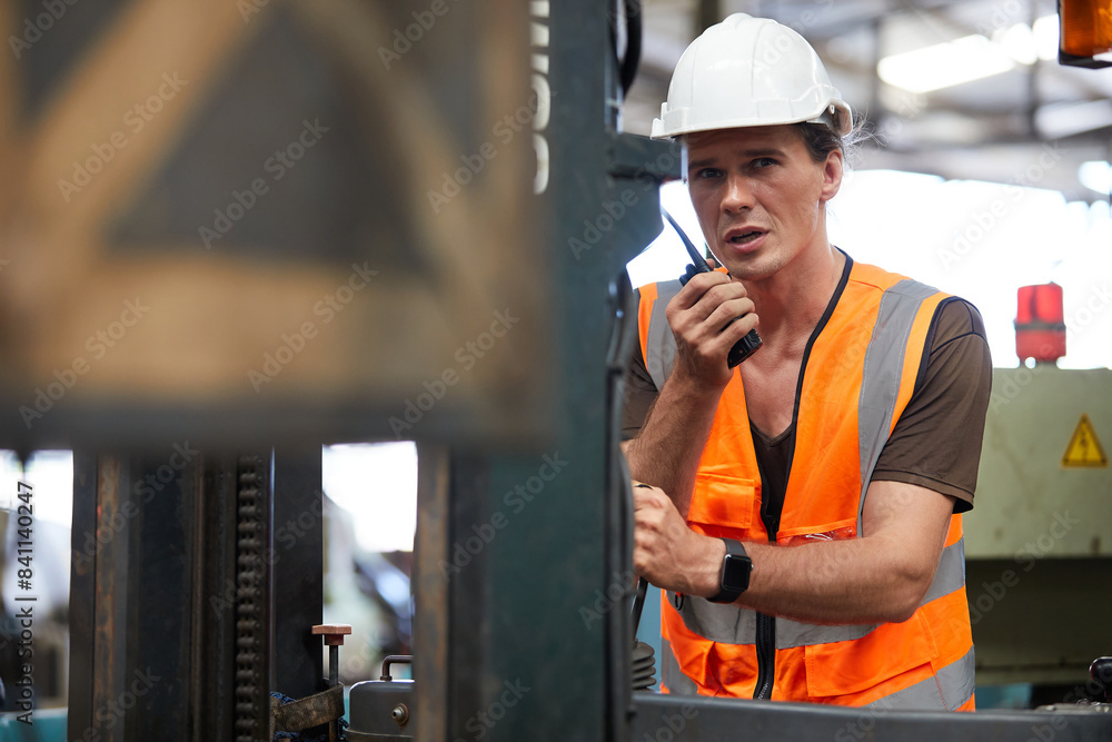 factory worker using walkie talkie and holding steering wheel on forklift truck