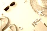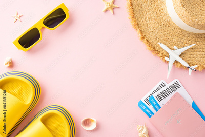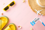 Flat lay of summer travel essentials including yellow sunglasses, a straw hat, slippers, passport, and boarding pass, creating a vacation vibe
