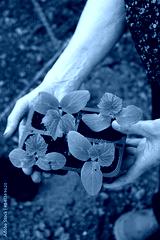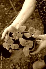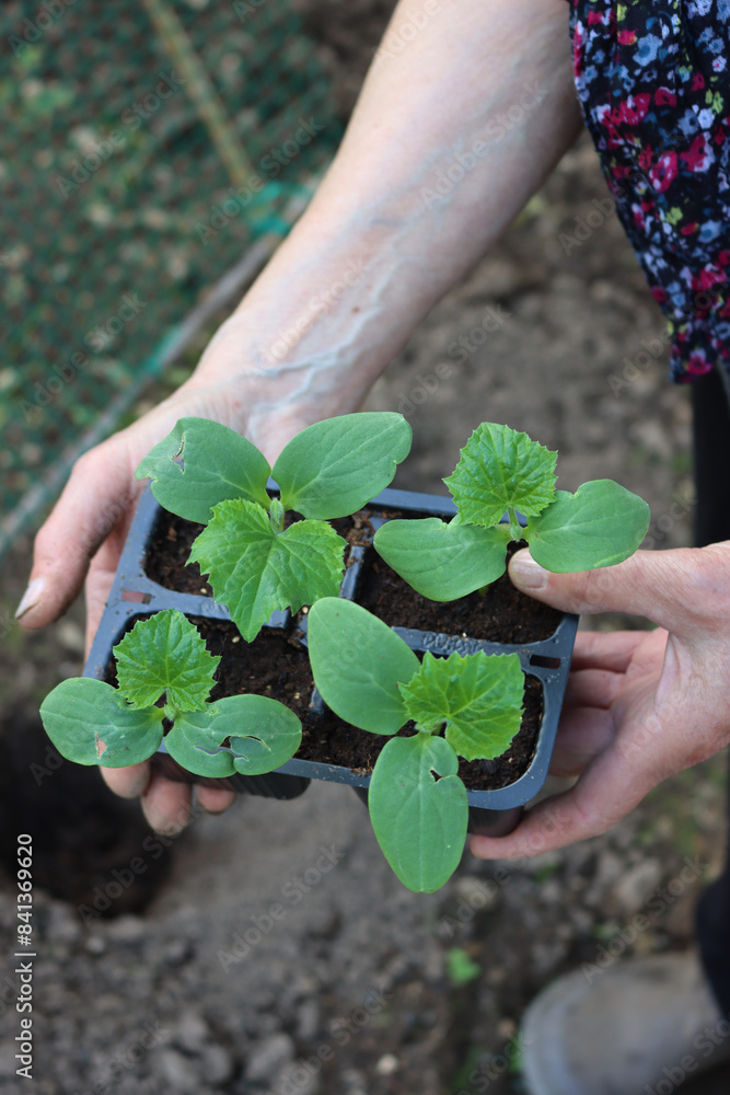 Cucumber plants transplant in the vegetable garden: close-up of woman’s hand with cucumber plants