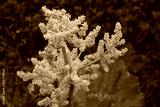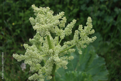 Close-up of red Rhubarb plant with white flowers on branches against green background. Rheum rhabarbarum