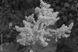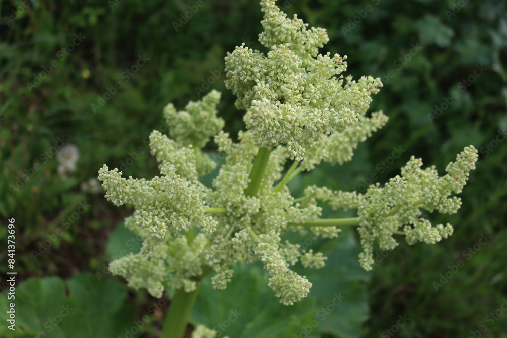 Close-up of red Rhubarb plant with white flowers on branches against green background. Rheum rhabarbarum