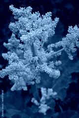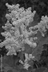 Close-up of red Rhubarb plant with white flowers on branches against green background. Rheum rhabarbarum