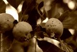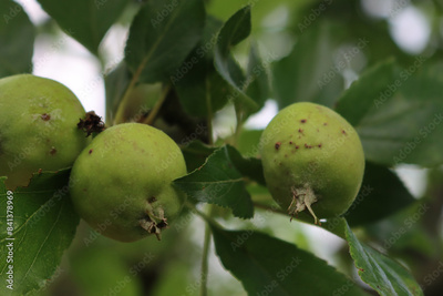 Apple scab caused by Venturia inaequalis on green Granny Smith apple on tree in the orchard. Malus domestica