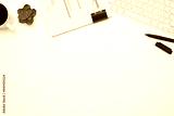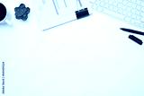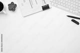 Office desk with financial reports, keyboard and cup of coffee. Top view with copy space