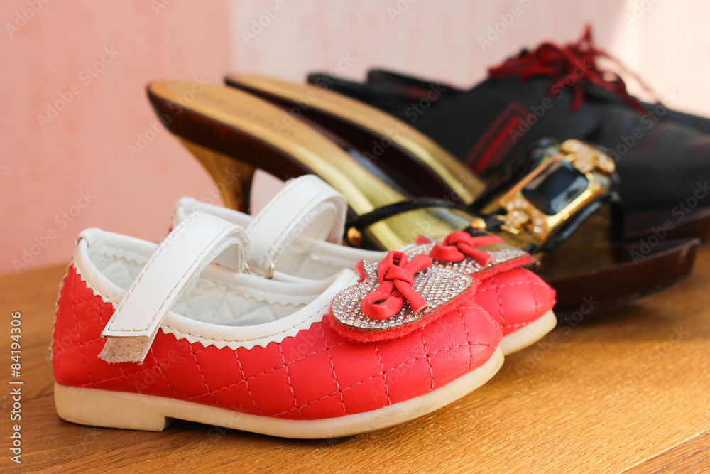 Three pairs of shoes: men, women and children.