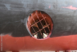 Cargo vessel in dry dock on ship repairing yard. Bow thruster.