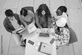 High angle view of a group of multiracial students doing the highschool homework using a laptop to search info. Classmates studying together on the university campus library, learning the lesson
