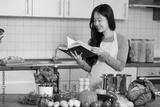 Asian smiling woman looking a cookbook