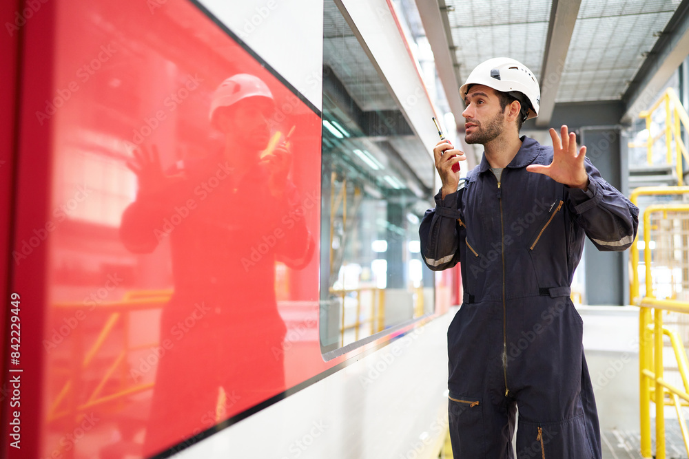 Technician or worker talking about work on walkie talkie and checking at construction train station