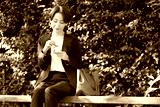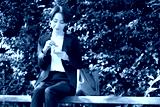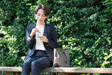 公園のベンチでおにぎりを食べるビジネス女性