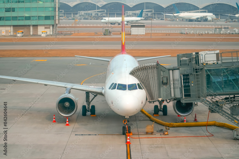 Front straight view of the body passenger airplane at the boarding bridge, against the backdrop airport apron terminal