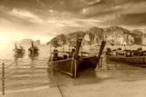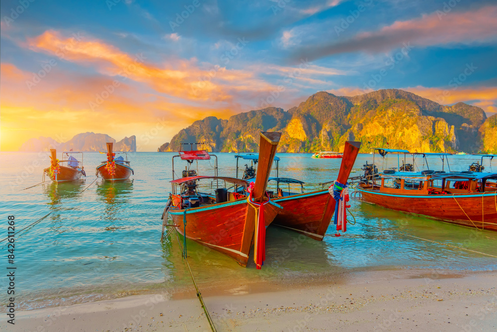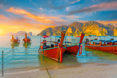 Longtail boats at the beautiful beach Thailand early morning at dawn beautiful sky clouds over sharks in the ocean