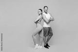 Full body young confident cool strong fitness trainer sporty two man woman wear blue clothes spend time in home gym stand back to back isolated on plain yellow background. Workout sport fit concept.