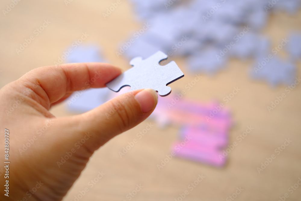 female hand holds cardboard puzzle piece, logical skills, puzzle solving and memory improvement, business concept for completing