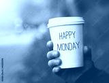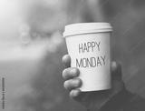 hand holding paper cup of coffee with Happy Monday motivational