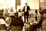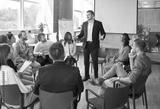 Business people chatting on conference. Company employees talking in office and making great decisions with brainstorming. Cowokers listen to their colleague sitting in a circle in meeting room.