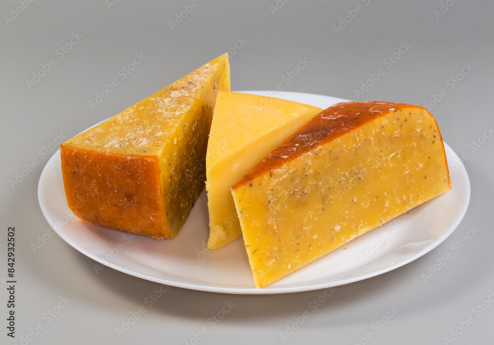 Pieces of different hard cheese on dish on gray background