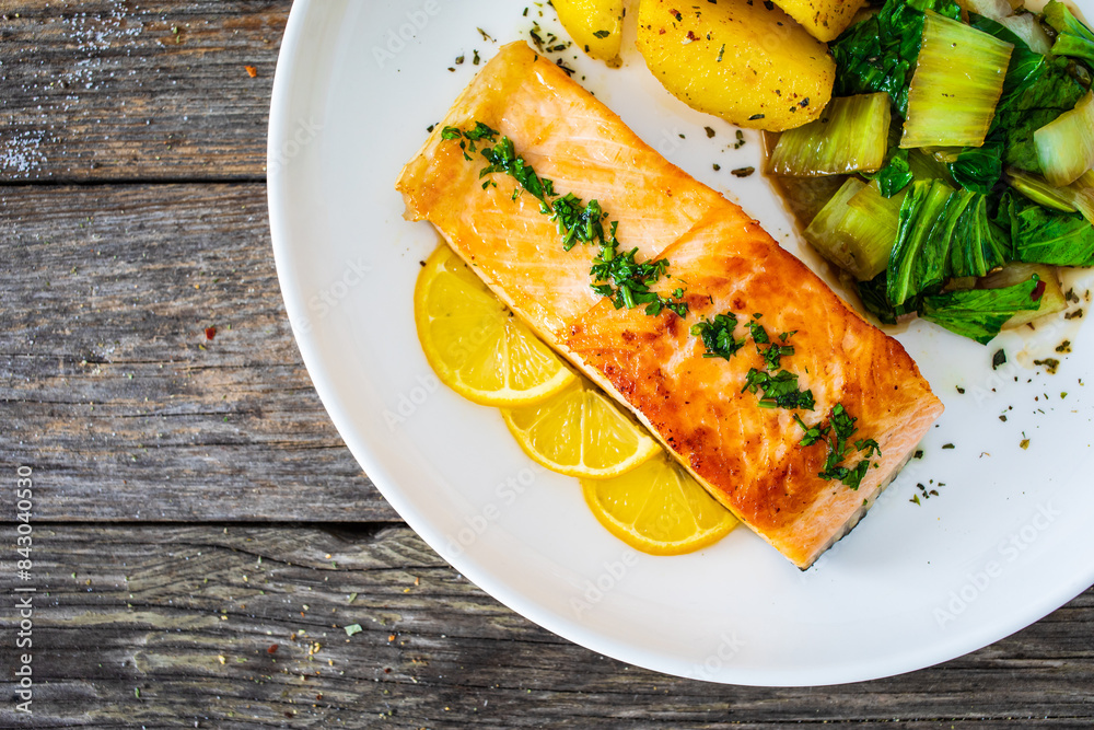 Fried salmon steak with lemon, fried potatoes and pak choi cabbage served on wooden table