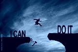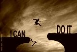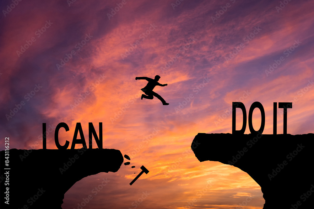 Man jumping on I can do it or I can't do it text over cliff on sunset background, Business concept idea