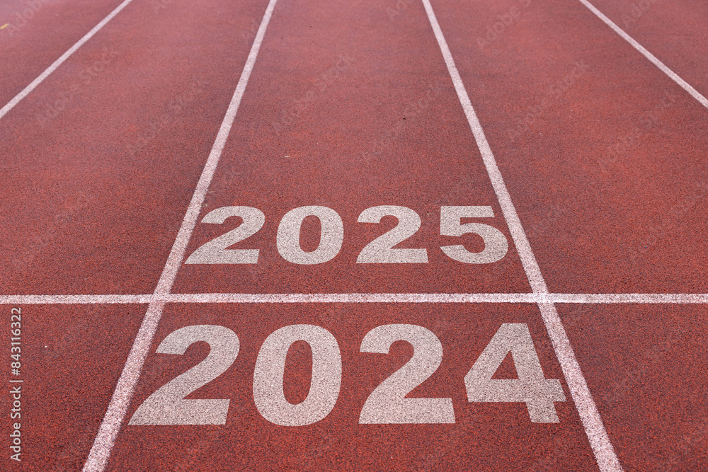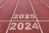 Start of new year. Changes of year 2024, 2025, 2026 on Running track. Concept of new ideas starting in new year, planning along with setting objectives to set KPI goals for success in life.