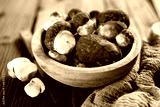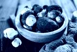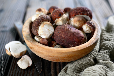 Wooden bowl with fresh wild porcini mushrooms and knife on rustic wooden table