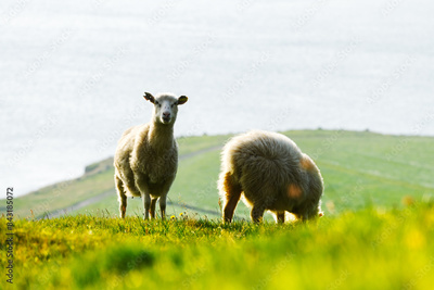Two sheeps on a lush pasture on Faroe islands. Streymoy island, Denmark, Faroe islands. Landscape photography