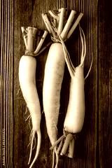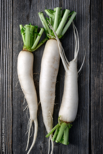 Three white daikon radish roots on rustic wooden table close up. Food photography
