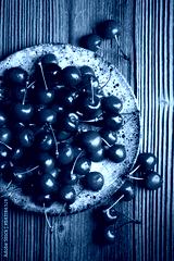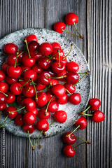 Ripe red cherries in a plate on rustic wooden table. Food photography