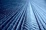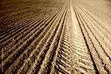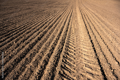 Plowed agricultural field with even rows and tractor track. Fertile soil ready for planting