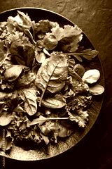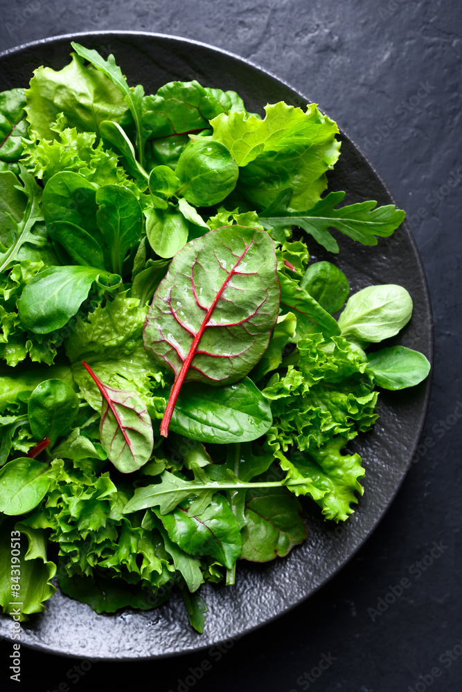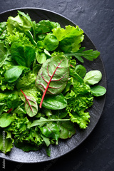 A mix of fresh, raw salad greens on a black plate. Includes lettuce, escarole, spinach, romaine, radicchio, lamb's lettuce, arugula. Healthy, low-calorie food ideal for a diet. Top view