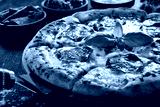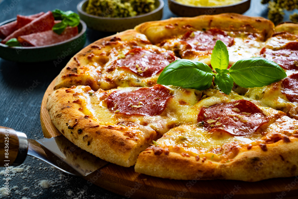 Circle pepperoni pizza with mozzarella cheese on black wooden table