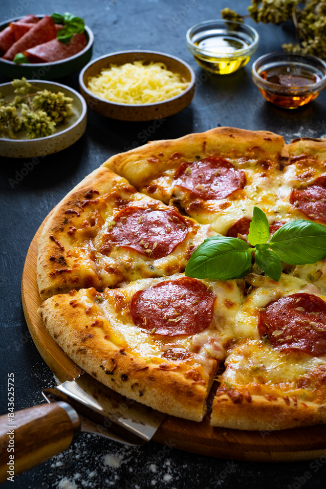 Circle pepperoni pizza with mozzarella cheese on black wooden table