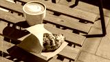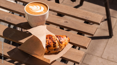 French breakfast with hot cappuccino coffee and freshly baked croissant served on the table in the cafe terrace. takeaway meal food, morning sun light